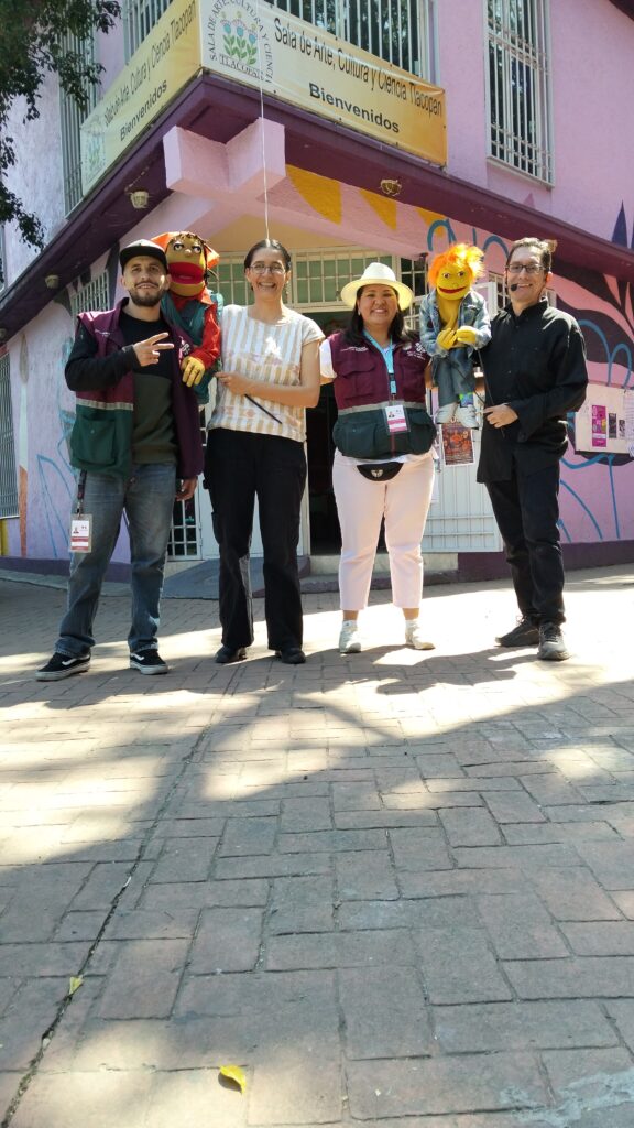 Aquí la vista de la Casa de Arte, Cultura y Ciencia Tlacopan, con Don Tlacuache, Emilia Reneé, Eli, Jhonatan y todos muy contentos después de la función.
